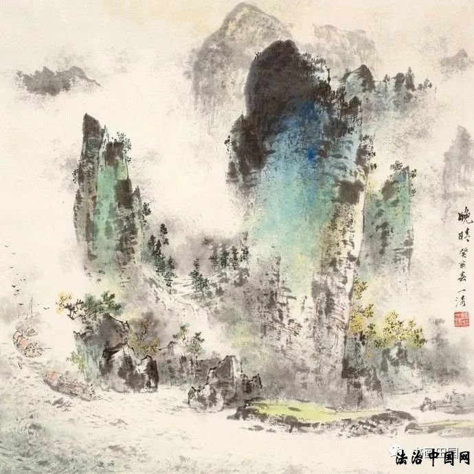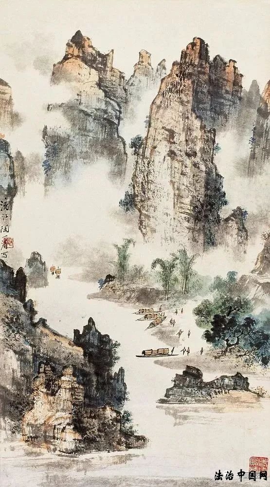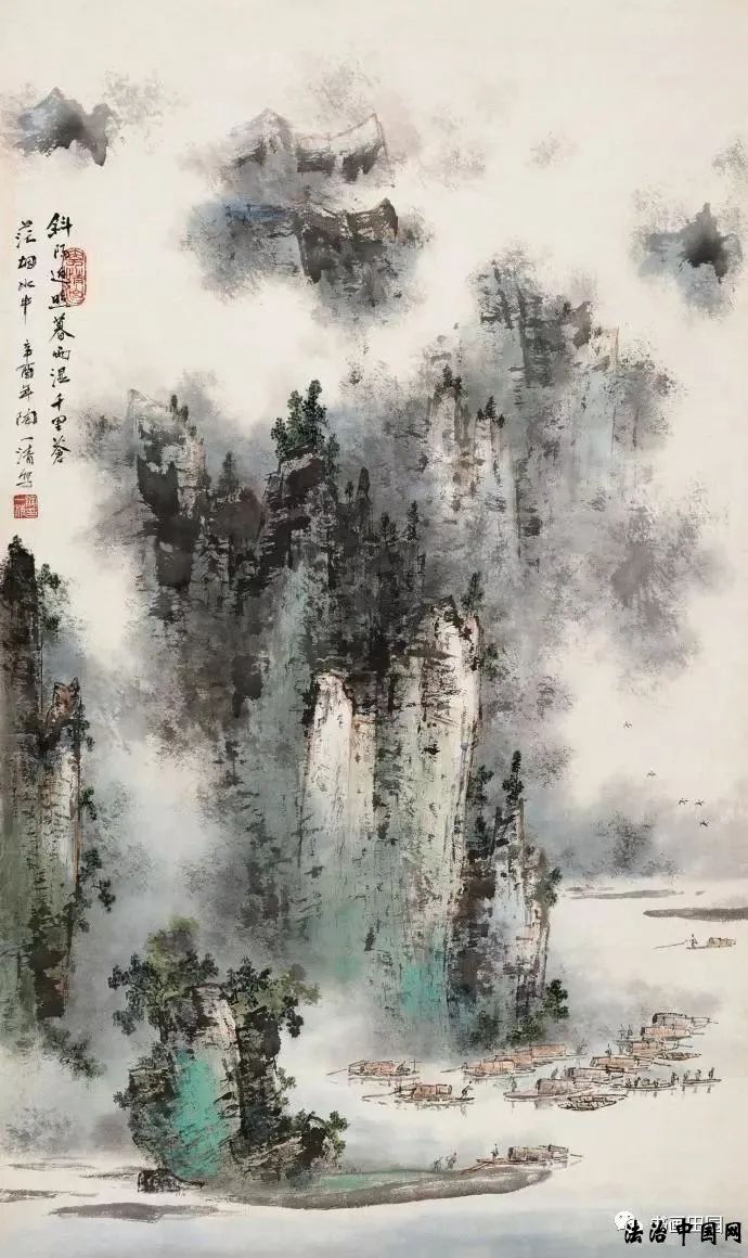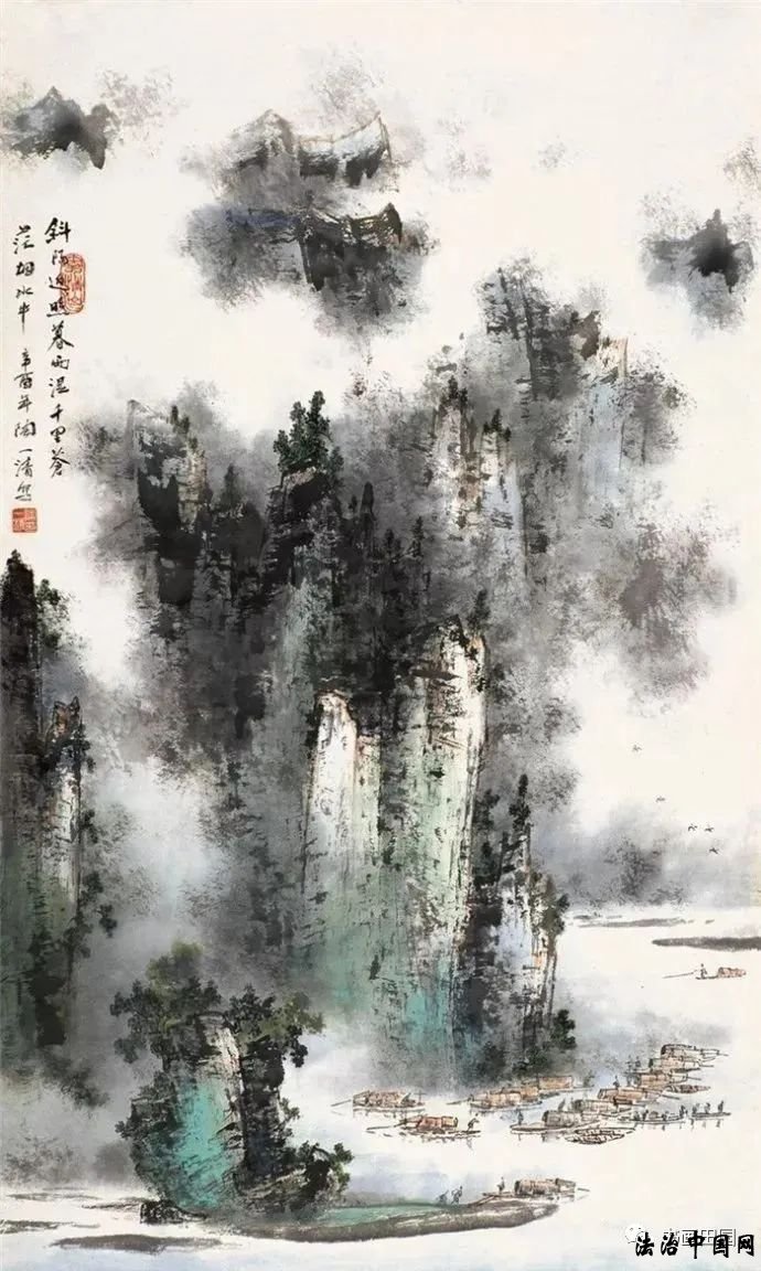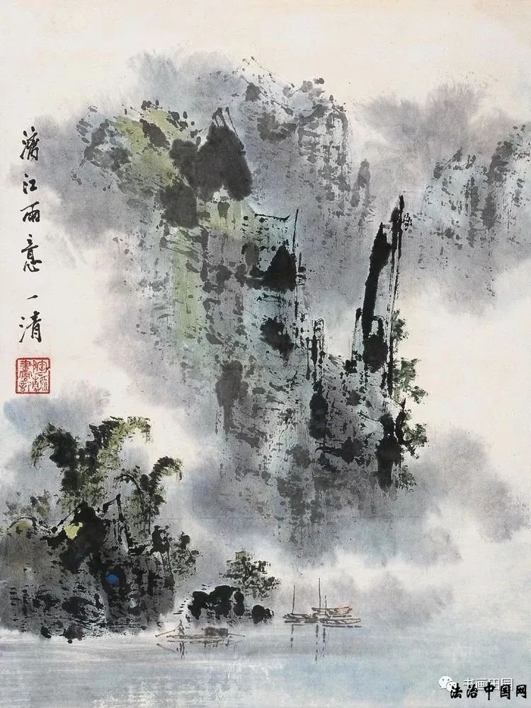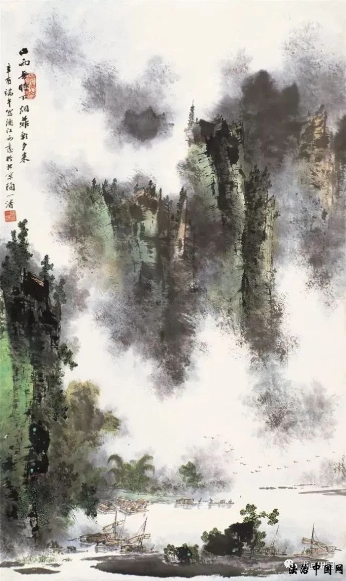 以上一组画是陶一清先生笔下的漓江山水作品,他在绘画创作中采取传统“以大观小”的处理方法,以形写神,把漓江之精髓活跃纸上。烟岚清奇之境,经一清先生之手刻画,亦呈妩媚。