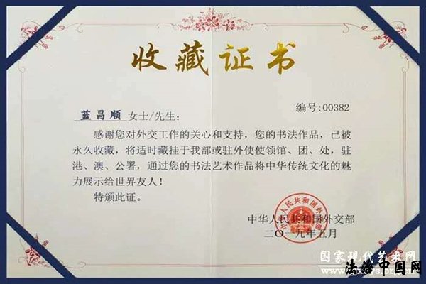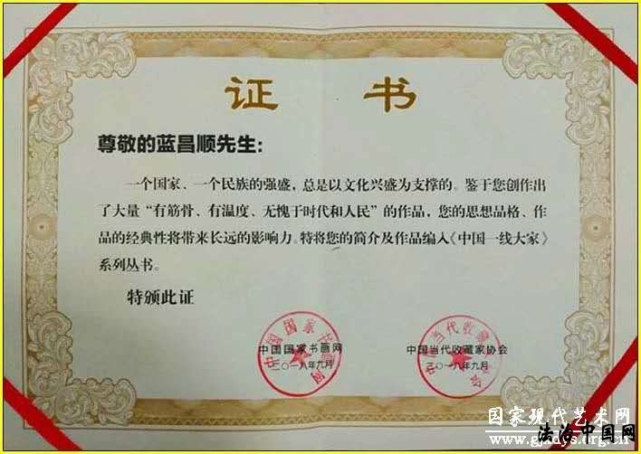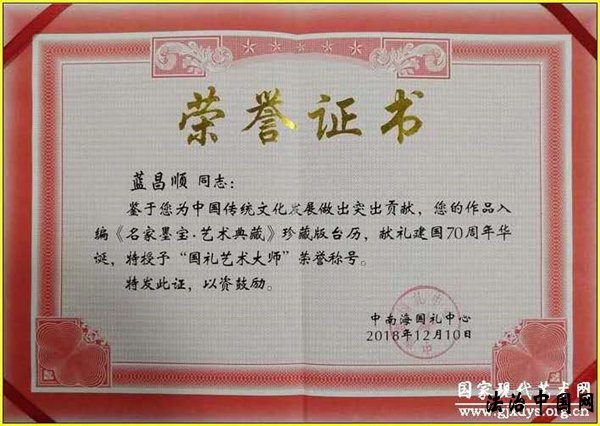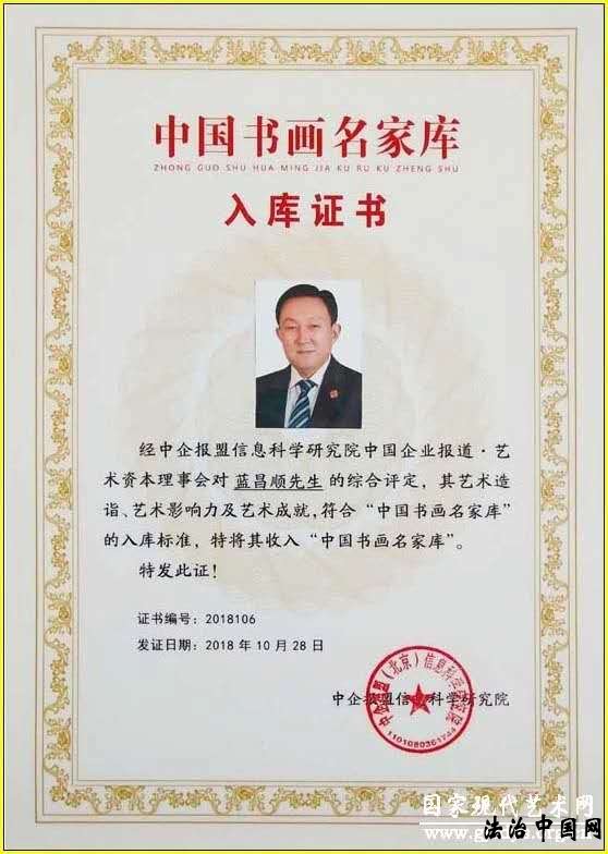 2018年入编《中国一线书法家》10人合集;2018年10月书法作品《腾飞》和《海纳百川》被西安世博园珍宝博物馆收藏;2018年10月被中企报盟信息科学研究院收入“中国书画名家库”;2018年11月被“中华名家网”聘为高级研究员;2018年11月蓝昌顺介绍和书法作品入编人民日报《人民周刊》杂志社和中国国际报告文学研究会联合出版的大型文献《聚焦·四十周年》;2018年12月被中南海国礼中心授予“国礼艺术大师”荣誉称号;2018年12月荣获“中印文化传承金砖奖”;2019年1月被中国民族艺术研究院和北京艺联诗书画院评为“中国艺术金莲花奖”;2019年5月参与中国民族建筑研究会书画艺术专业委员会在民族文化宫举办的“辉煌历程·民族脊梁”——庆祝新中国成立70周年民族书画家作品展;2019年5月蓝昌顺书法作品被中华人民共和国外交部收藏。2020年2月18日至3月5日以个人名义在微信朋友圈及网络平台举办“义卖书法作品,联袂支持抗疫”活动,给湖北省慈善总会捐善款7668元,用于支持抗疫。