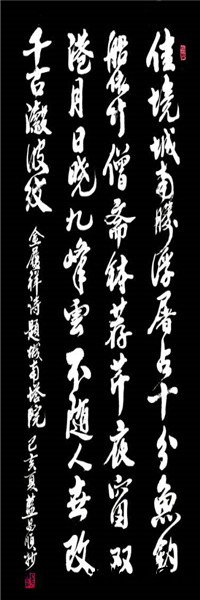 在当代书法艺术的变革中,书法由传统的实用性,走向了以“可观”为主要艺术价值的欣赏功能。书法也有一项大众技能,渐渐演变成了精英专家的艺术才华。蓝昌顺的书法创作,恰好切准了时代艺术的主流脉象,塑造功进展厅的艺术特征,极其重视书法的形式与形态效果,不但书写细腻,也写书法的宏大,从书法的结体和章法求成新颖动人,正是挂装最佳,欣赏最美的书法杰作典范。可以说他的书法在用笔、用墨、结体、章法四个方面,有师古却不拘泥于古的综合新成,形成了自己书法艺术特有的品牌特征。