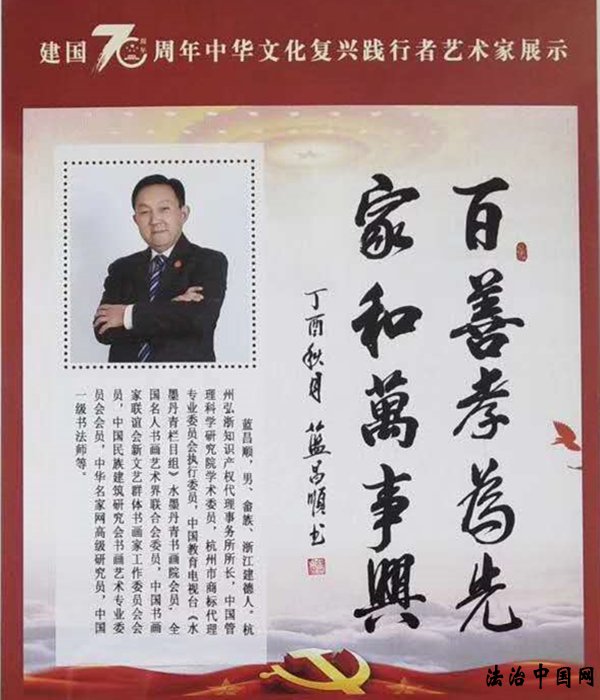 浙江人杰地灵,浙商名满天下。当代著名书法家蓝昌顺先生以雄劲动逸的翰墨功力,济身于人杰之列,又以知识产权专家、商标品牌顾问的商界功勋,成为浙商名满天下群体中的列要成员!提及电子商务,大家熟知马云,提及品牌商标的培育与保护战略,蓝昌顺先生的大名同样无人不知,无人不晓。