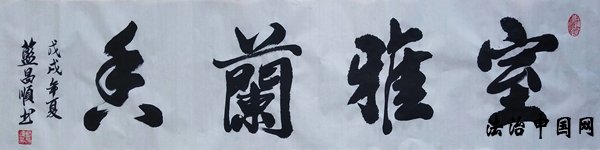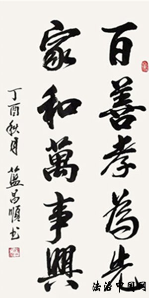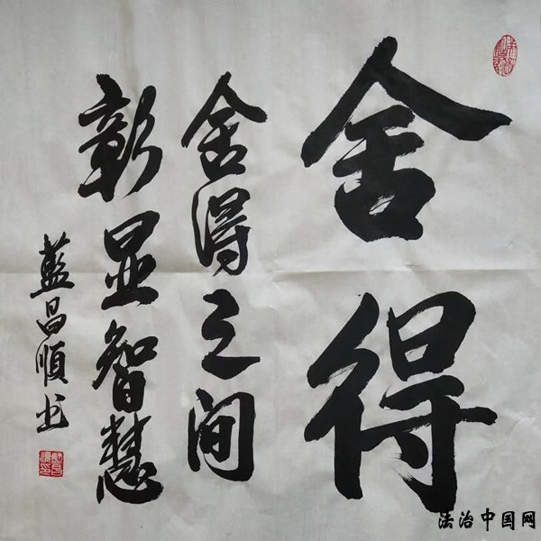 行书是蓝昌顺用书法表达自己文化情怀的中意窗口,笔法飘逸,墨丽明质,有明显的师法二王的法度核心。自由爽质,入目入心,有一种古风悠然生,儒雅已入怀的艺术感染力。同时,他的书法还有米芾书法的泼辣与坚韧,宣面笔迹,极尽力透纸背的实功,力挽千钧,腕下能翻江。