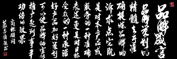 重视书法艺术品价值的创建,除了让蓝昌顺的书法艺术得到了独成一格,专成造诣的艺术收获,还带动他的艺术思维闯进了品牌价值的研究天地,成为非常知名的品牌顾问。他站有文化的高度为企业、为艺术家创建品牌提升品牌,打造品牌的文化含量,让商业与文化紧密结合,让商标具备百年昌盛的文化底蕴,在行业内成为借助文化打造品牌的美名专家顾问。