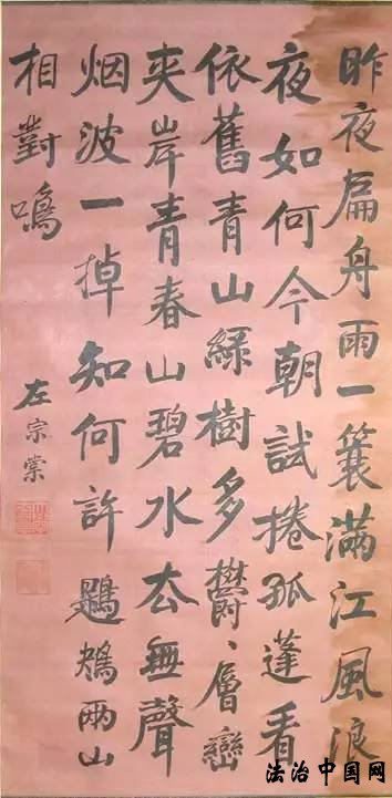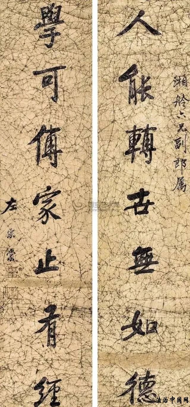 左宗棠身为武将,兼通文墨,擅书法,崇碑版,篆、隶、行、草兼善,笔力雄健,风格豪迈,楹联作品流传颇多,为时人所爱。据说,他从12岁开始,就爱好书法。其书风沉着激迈,文辞通畅,瘦劲的笔致、清峭的结字和疏朗的布局,依稀透露出一种踌躇满志的盛气。近人评价他的书法称:“文襄公行书出清臣(颜真卿)、诚恳(柳公权),北碑亦时凑笔端,故肃然森立、劲中见厚。”