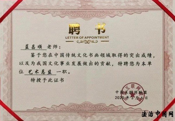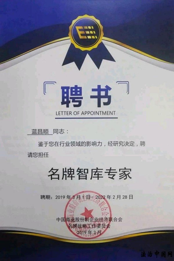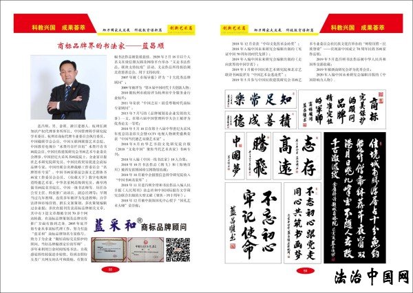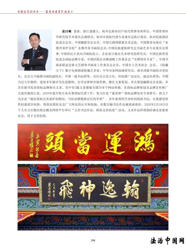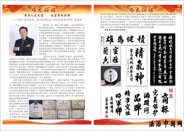![]() ![]() 商标品牌界的书法家——蓝昌顺 蓝昌顺,男、畲族、浙江建德人。杭州弘浙知识产权代理事务所所长,中国管理科学研究院学术委员会调研员,杭州市商标代理专业委员会执行委员,杭州民族团结促进会会员,中国楹联学会会员,中国互联网联盟艺术总监,中国教育电视台“水墨丹青栏目组”水墨丹青书画院会员,中国民族建筑研究会书画艺术专业委员会理事,中国世纪大采风书画院院士,企业家日报社艺术研究院研究员,中国民族贸易促进会商标品牌专家,新时代品牌强国蓝海工程·名牌智库专家顾问,中国书画家联谊会新文艺群体书画家工作委员会会员,中国乡土艺术协会 会员,《收藏天下》数字电视频道特邀艺术家,中华名家网高级研究员,曲阜鸿儒书画院名誉院长,北京古今翰墨书画院副院长,中国一级书法师等。历任办公室主任、科技推广站站长、副总经理等;早期当过九年教师,连续多年被评为先进教师;自学法律和市场营⑸贸の陌覆呋啻尾呋嗉笠当ǎ欢啻卧诒ǹ⒈砩瘫昶放葡喙匚恼拢渲杏�3篇文章都被全国70多个网站转载。在商标品牌策划及品牌宣传推广方面有独到之处。2005年底开始专业从事商标代理工作,努力打造“蓝采和”商标品牌知名专家称号,致力于为企业“做好商标完美保护的顾问,当好品牌精准定位的军师”。多年来利用空余时间练练书法,自我感觉悟性较强进步较快,得到亲朋好友及广大网友的认可和鼓励,有数百幅书法作品被装裱悬挂。2020年2月18日以个人名义在微信朋友圈及网络平台举行“义卖书法作品,联袂支持抗疫”活动,义卖作品所得捐给湖北省慈善总会,用于支持抗疫。