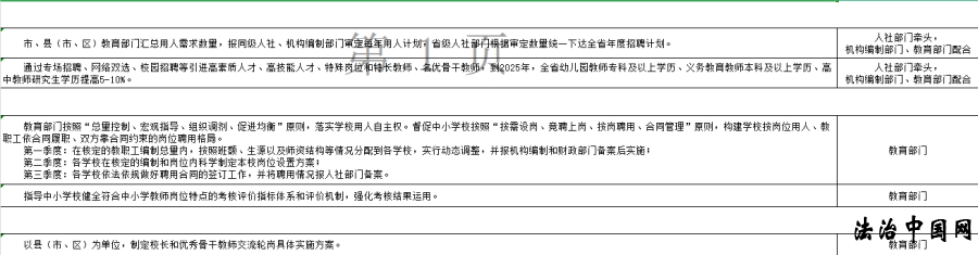 7.完善招聘办法。市、县(市、区)教育部门汇总用人需求数量,报同级人社、机构编制部门审定每年用人计划,省级人社部门根据审定数量统一下达全省年度招聘计划。存在超编的市、县(市、区),在本级超编人员消化完成以前,补充教师实行“退三进一”,超编比例达100%以上的,实行“退五进一”。严格教师资格准入。由教育部门会同人社部门制定符合教师职业特点的招聘方案,探索面试+笔试、直接面试、考察聘用等考试办法,通过公开招聘、特岗计划、公费师范生、优师计划、人才引进等方式统筹做好教师招聘工作。优先保障乡村学校、薄弱学校以及思政、音体美劳、心理健康、科学、信息、卫生技术人员、幼儿教师等紧缺岗位。支持学校充分参与招聘各环节工作,具备条件的学校可自主招聘。