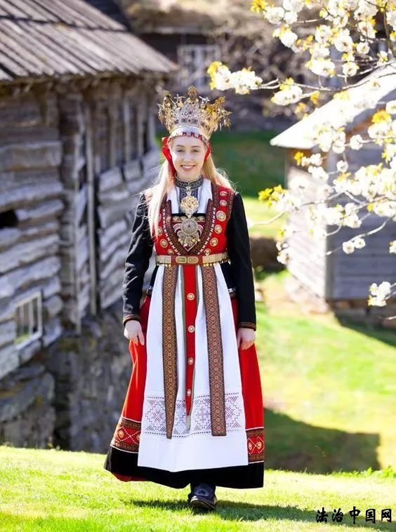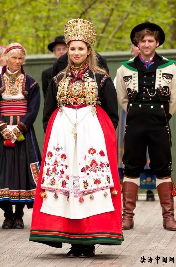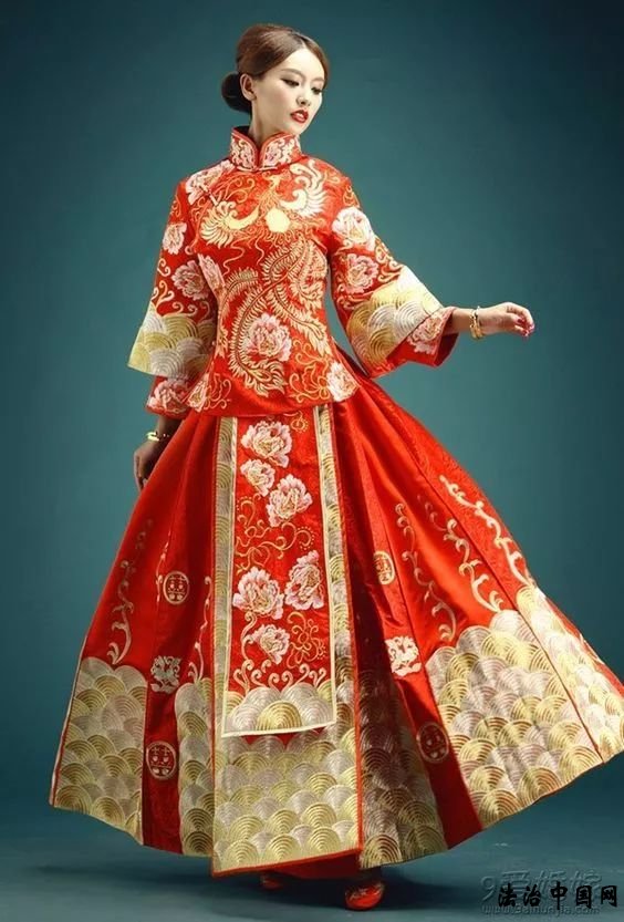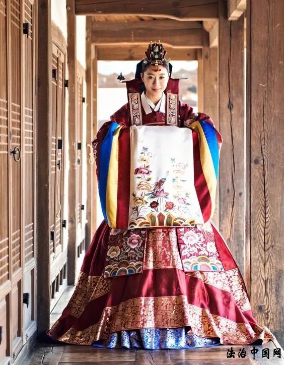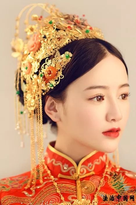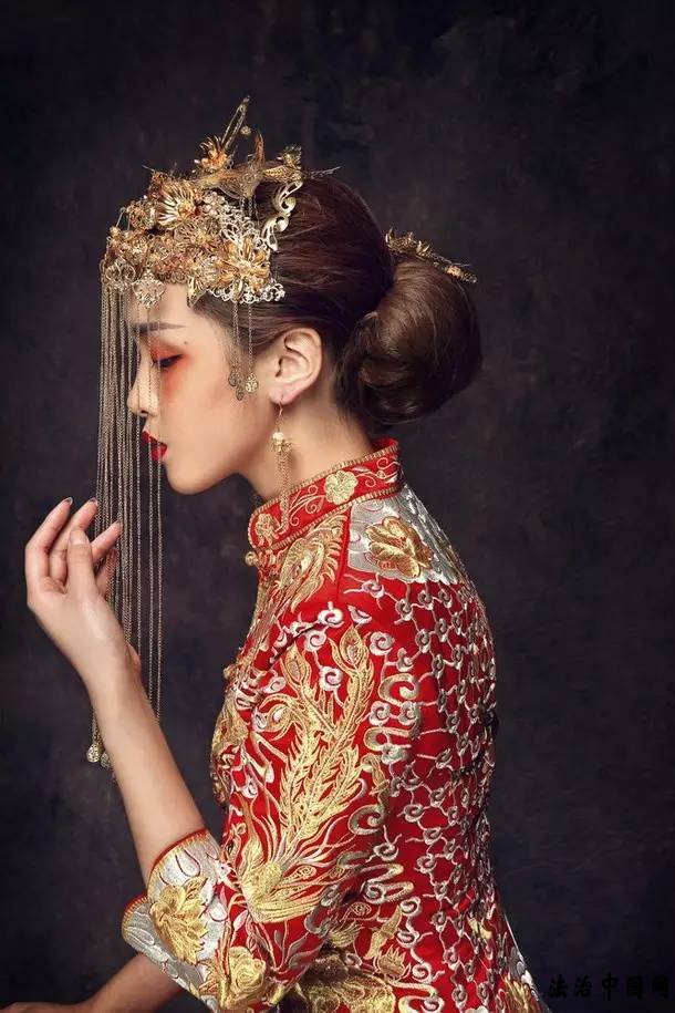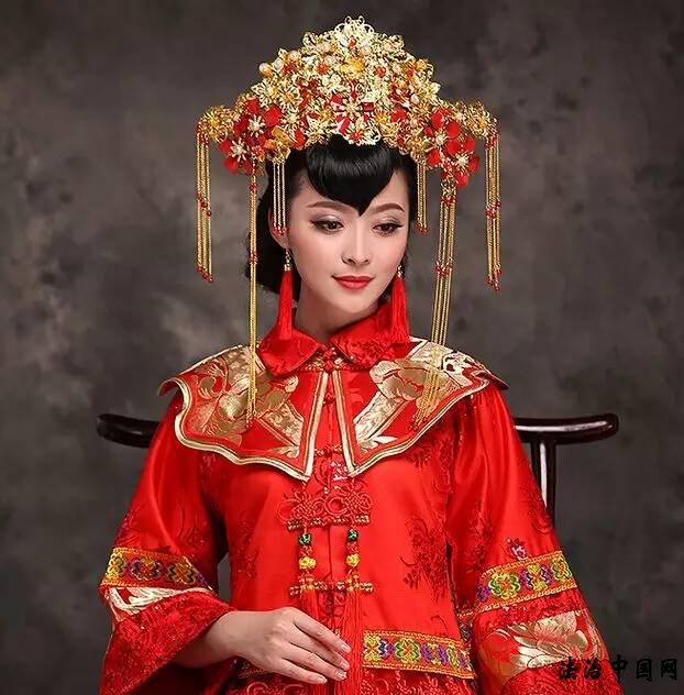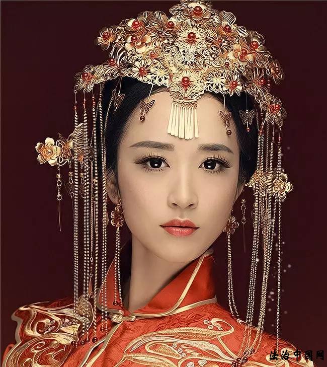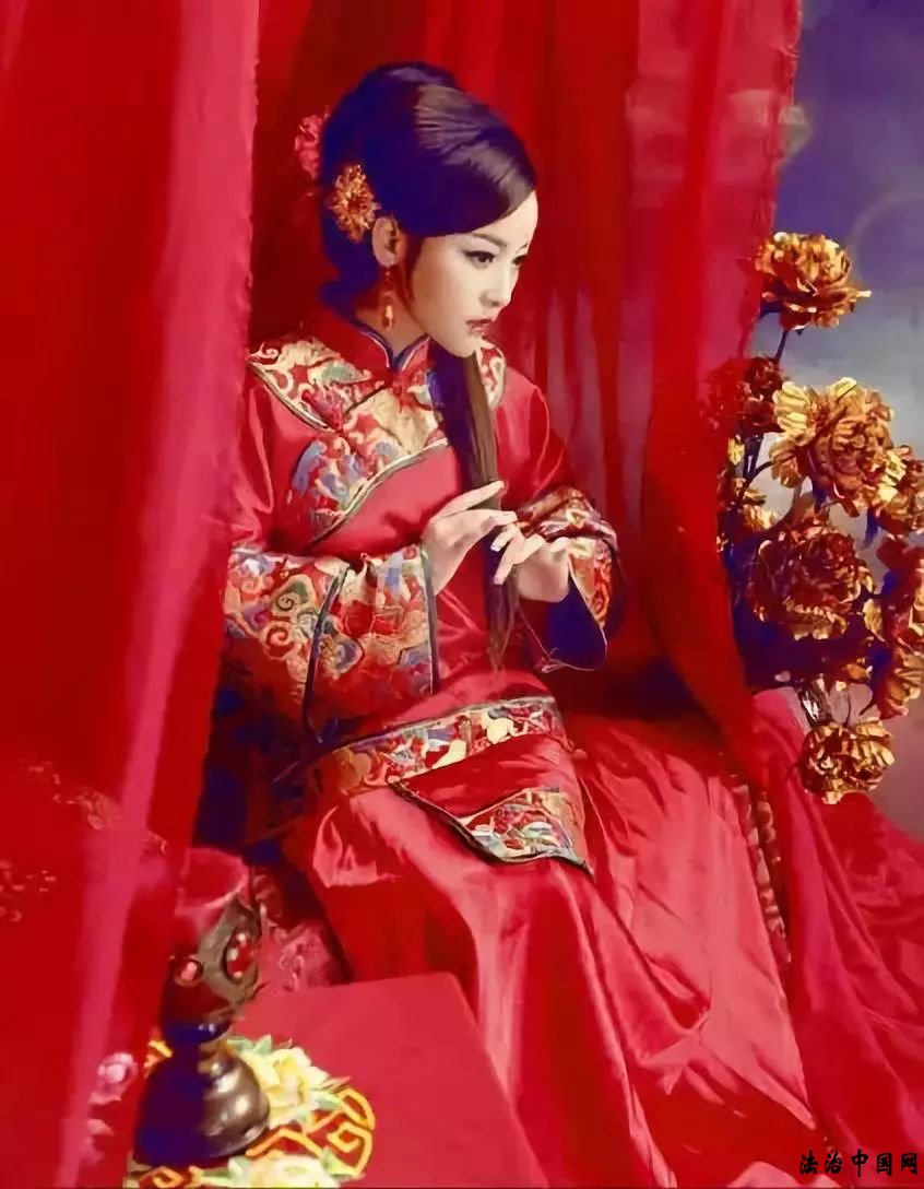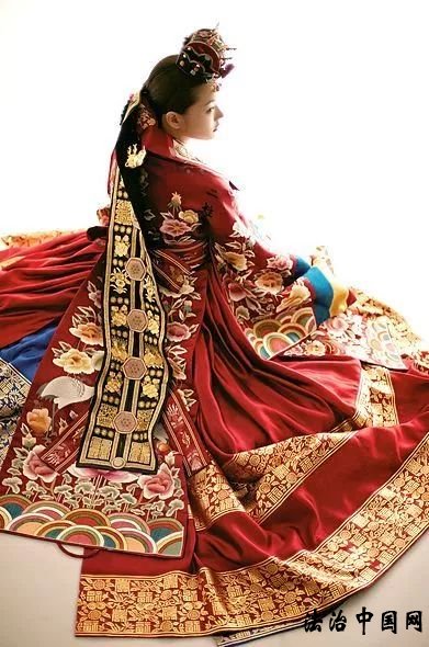 缨络垂旒,玉带蟒袍,着百花裥裙,穿大红绣鞋。
