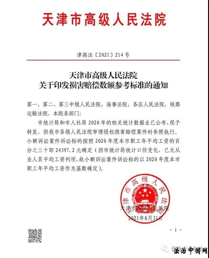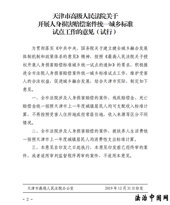 为依法妥善审理涉及人身损害赔偿案件,2019年12月30日天津市高级人民法院第35次审判委员会审议通过了《天津市高级人民法院关于开展人身损害赔偿案件统一城乡标准试点工作的意见(试行)》,现予印发,并自印发之日起试行。如执行中遇到问题,请及时报告高院民一庭。