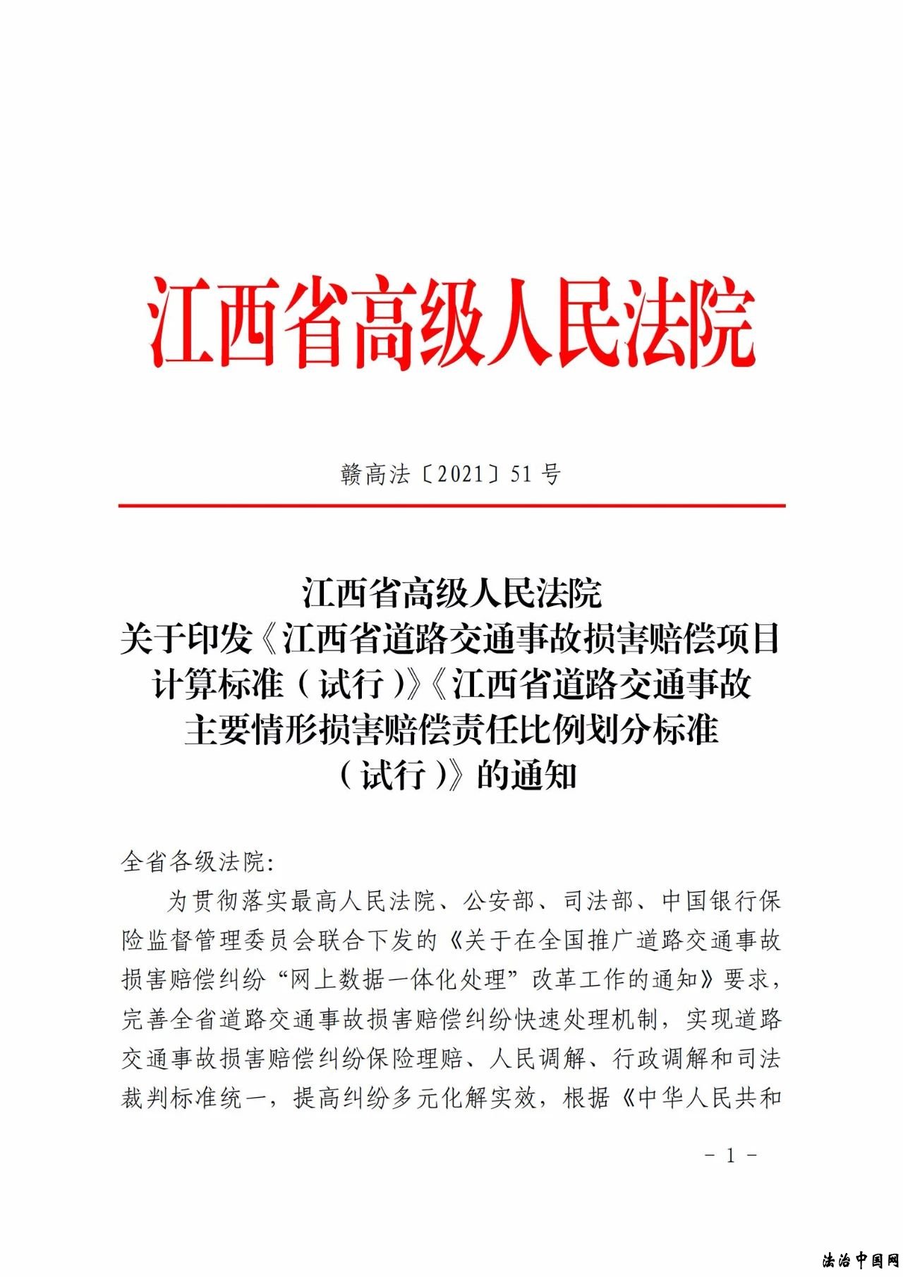 江西省高级人民法院关于印发《江西省道路交通事故损害赔偿项目计算标准(试行)》《江西省道路交通事故主要情形损害赔偿责任比例划分标准(试行)》的通知