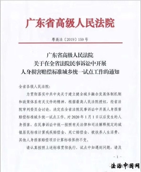 一、广东省高级人民法院关于在全省法院民事诉讼中开展人身损害赔偿标准城乡统一试点工作的通知