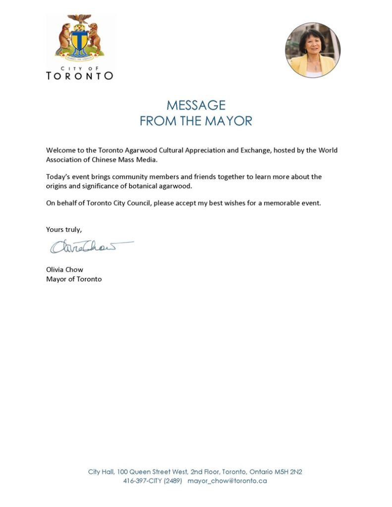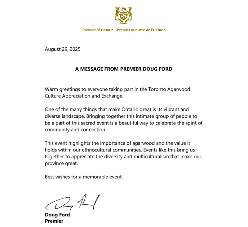 – 安大略省省长道格·福特(Doug Ford)致贺,称沉香是安省多元文化的瑰宝,赞美本次盛会是“凝聚社区、庆祝多元的盛会,让我们的省份更加伟大。”