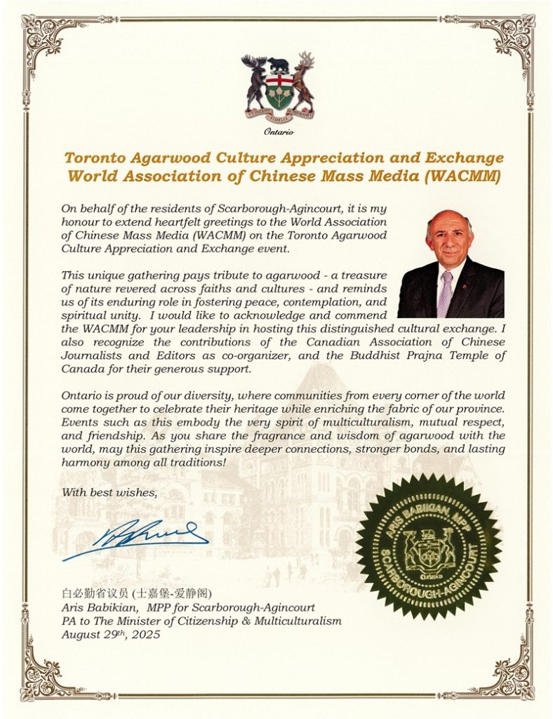 – 安大略省省议员白必勤(Aris Babikian, MPP)致贺,称沉香为“跨越信仰的文化瑰宝”,祝愿活动“促进深度交流与持久和谐”。