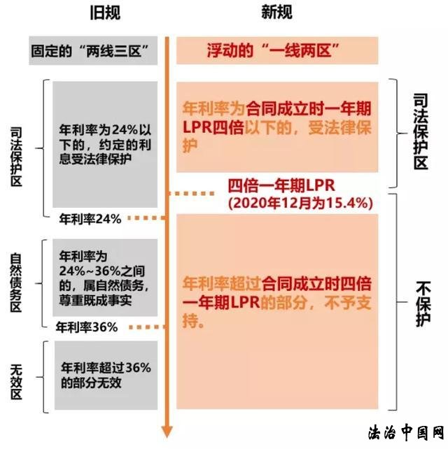 利率保护上限用通俗的话说,就是最高法为民间借贷利率规定了一个最高值,超过这个最高值的利息,即使借贷双方约定,起诉时法院也不会支持偿还。原先的司法实践中,法院采取“固定的两线三区”的规定,而《新规》实施后调整为“浮动的一线两区”。
